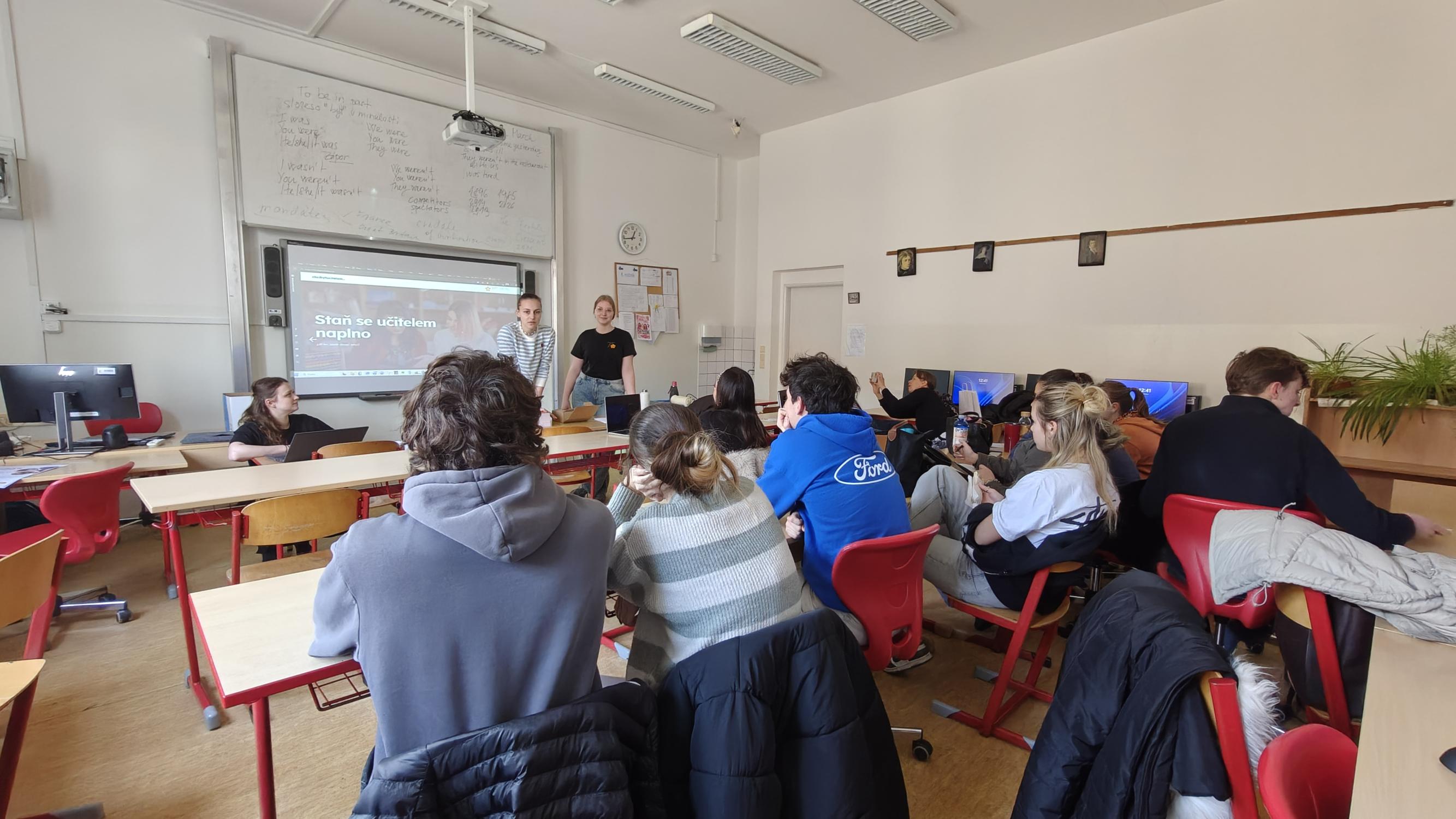 ... jejíž fakultní školou jsme se stali poměrně nedávno, aby nám představily možnosti studia na PF a především jejich pětiletý magisterský pedagogický studijní obor. Ten dává lepší možnosti volby školních praxí už od začátku studia, aby si studenti mohli hned ozkoušet, zda je učení pro ně to pravé. Zároveň je povinnost psaní pouze jedné závěrečné práce, což mnoho, nejen na praxi orientovaných, studentů určitě ocení :) Děkujeme za milou návštěvu a užitečnou prezentaci pro naše studenty!
