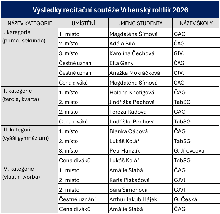 Letošní, již 26. ročník, Vrbenského rohlíku přinesl s sebou jisté územní rozšíření: z recitační soutěže českobudějovických gymnázií jsme se stali soutěží jihočeskou, neboť se vedle ČAG, Gymnázia Česká, Gymnázia Jírovcova a Gymnázia Jana Valeriána Jirsíka k nám nově připojilo i Táborské soukromé gymnázium. Doufáme, že toto jejich poprvé nebylo i naposled a že se zařadí mezi stálé účastníky akce.